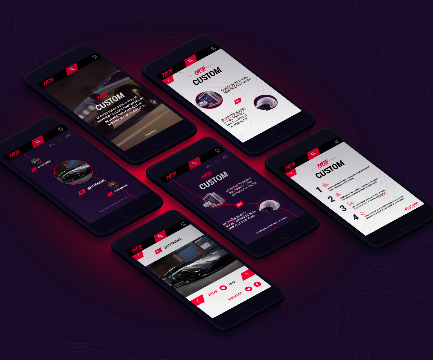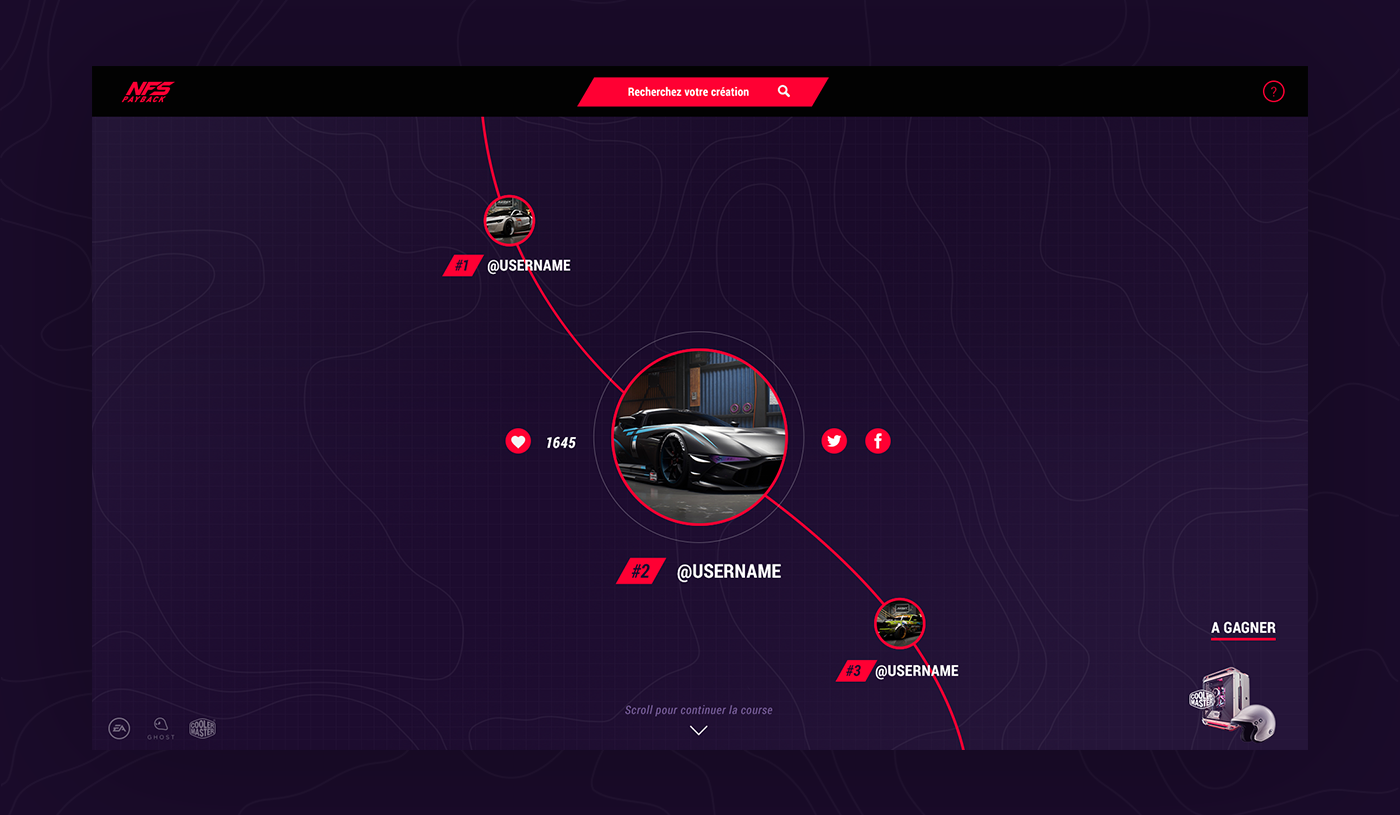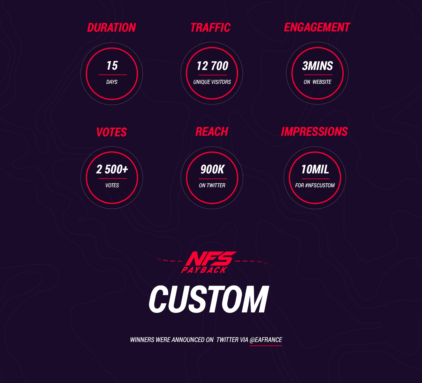 A digital race featuring custom creations from NFS Payback posted on Twitter with #nfscustom. Users can scroll to explore and help vote them to victory.